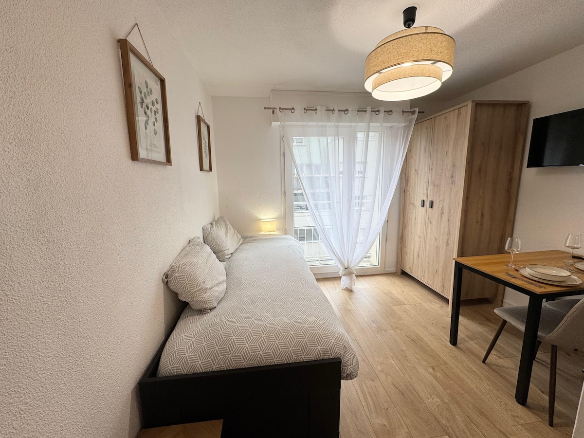 Härlig T1 bis i centrum. Perfekt läge, restauranger, teater, biografer, butiker, museer, allt ligger vid foten av lägenheten. Lägenheten ligger på tredje våningen i en vacker byggnad från 1800-talet. Granittrappan är bred. Jean Jacques-gatan är en mycket livlig gågata, men fördelen med vår lägenhet är att den vetter mot en mycket lugn privat innergård som är säkrad av 2 stängda dörrar. Cykelställ finns (upp till 2) så de kommer att vara säkra.