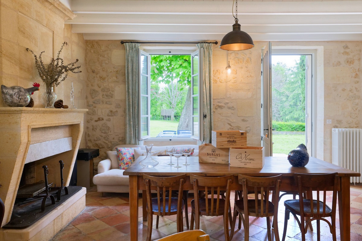 Detta charmiga hus med tre sovrum ligger mitt i en ekologisk vingård och är en lugn tillflyktsort bara 5 minuter från Bourg och 35 minuter från Bordeaux. Helt renoverat och har ett mysigt kök i lantlig stil med öppen utsikt Utanför kan du njuta av en privat pool och en grillplats, perfekt för avkoppling med familj eller vänner bland vinrankorna. Bekvämt och väl beläget, detta hus är en underbar bas för att utforska Bordeaux-regionen eller helt enkelt koppla av i en vacker landsbygdsmiljö.