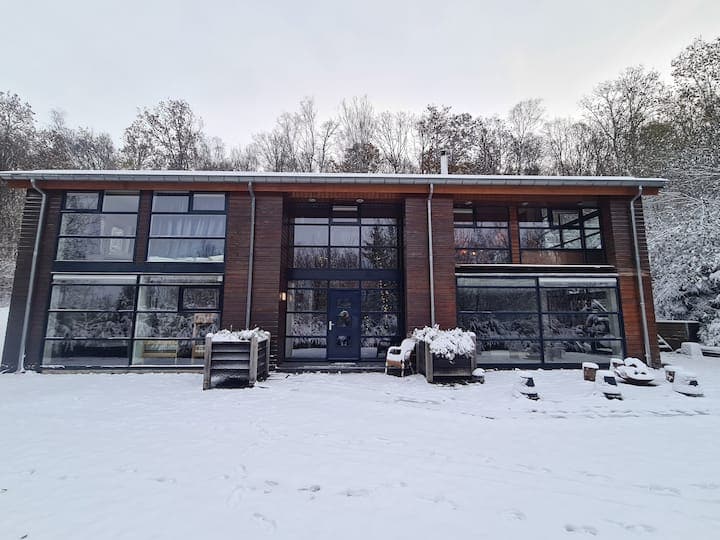 Chalet dans les bois avec piscine interieure