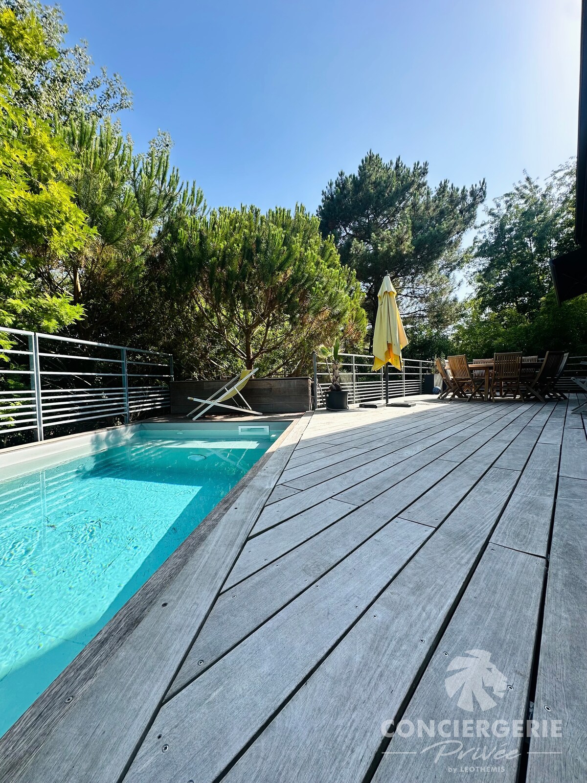 Ny 170 m² arkitektdesignad villa, klassificerad 5-stjärnigt möblerat turistboende, nära stranden, butiker och skog. 4 luftkonditionerade sovrum med 4 privata badrum. Det ljusa vardagsrummet vetter mot terrassen med stora galandage-fönster, för ett riktigt liv in- och ut. Sydvästläge träterrass, uppvärmd och säker pool. Lugn miljö mellan natur och hav. Concierge-service ingår för en bekväm vistelse.