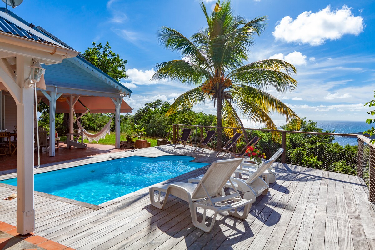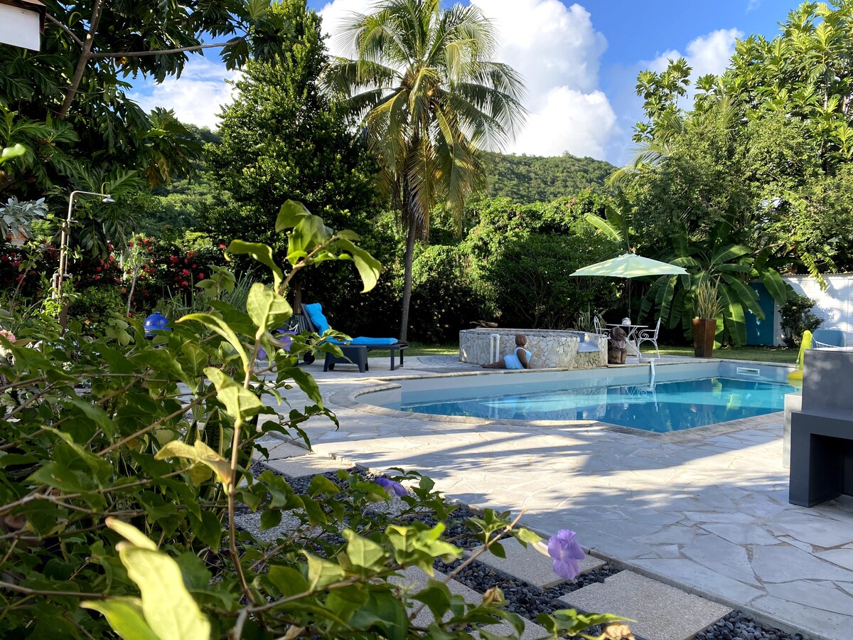 Traditionellt charmigt hus med pool med utsikt över havet (F4 med veranda, 3 luftkonditionerade sovrum, myggnät, clic-clac i vardagsrummet), en stor trädgård med fruktträd och kryddor på Caravelle-halvön. Nära till stranden i Trinité och Tartane (3 minuter). Nära butiker, tjänster, sjukhus. Vacker havsutsikt, lantlig charm, vandringar, närhet till havsvattenaktiviteter (stränder,surfing, segling)..... 1: a "frukost" erbjuds med lokala specialiteter....engelska, español.