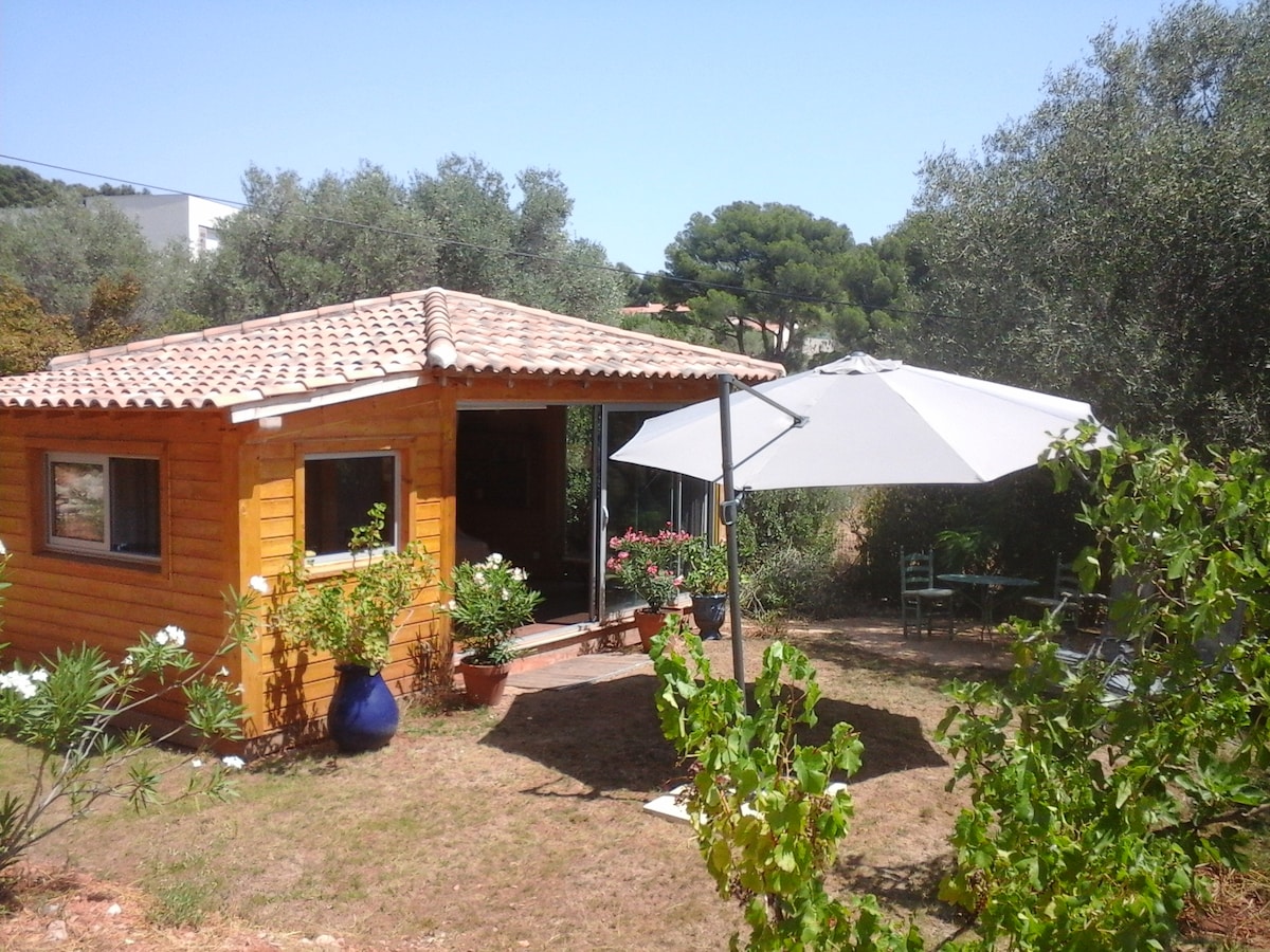 Mycket elegant, min all-trästuga ligger i en trädbevuxen park och vetter mot en liten vingård. Beläget inte långt från ett stort köpcentrum (20 minuters promenad, fem minuter med bil) dess naturliga miljö är inte förorenad av någon byggnad. Det lilla köket och duschen är bifogade men åtskilda från sovrummet med ingång med gardin. Du kan äta inne och ute . Stränderna ligger på mycket rimliga avstånd (mellan 20 minuter och 1/2 timme).