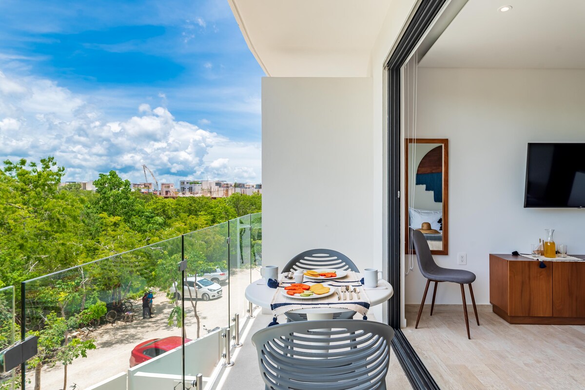 Centralt belägen toppvåning 1-rumslägenhet i hjärtat av La Veleta Tulum, på fjärde våningen, med butiker och restauranger inom gångavstånd. Njut av en vacker takterrass med pool, solstolar och bord. Lägenheten har 1 dubbelsäng i ett stort sovrum och rymligt badrum, ett fullt utrustat kök, smart-TV, stark luftkonditionering, privat 100 Mbps Wifi, matbord och privat uteterrass. Boutiquebyggnaden har en hiss och ligger bara 10 minuter från Tulums vackra stränder.