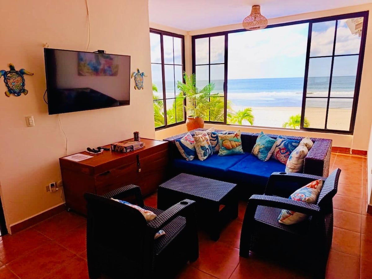 Hus med två sovrum vid havet i Popoyo, precis vid stranden. Ljust och luftigt, det har bekväma sovrum, ett fullt utrustat kök, ett öppet vardagsrum med fantastisk havsutsikt och en gemensam pool. Du kommer att bo på andra våningen. Koppla av på balkongen vid havet eller surfa på vågor i världsklass bara några minuter bort. Lugnt läge, men ändå nära Popoyos restauranger och strandbarer – perfekt för par, familjer eller vänner som söker en avslappnad semester. Luftkonditionering i vart och ett av sovrummen, snabbt internet.