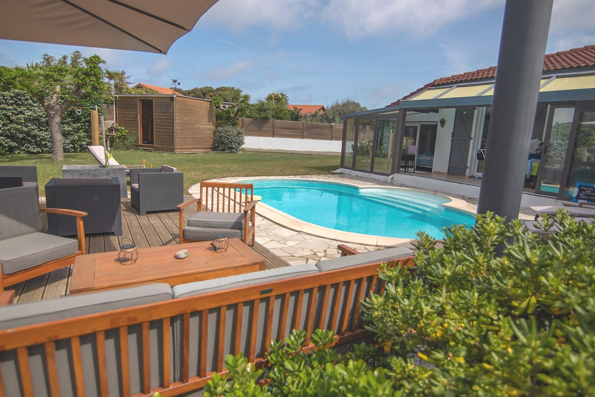 Hus helt renoverat 2020, stor komfort, mycket ljust och funktionellt. Vackert trädäck och eldgrop runt poolterrassen. Tillgång till skog, strand och butiker ( restaurang, stormarknad, bageri, cykeluthyrningsföretag, surfbutik, campingplatser till fots. Många cykelvägar, som betjänar städerna omgivande område: Capbreton, Hossegor, Bayonne. Ett litet hörn av himlen för en bilfri semester.