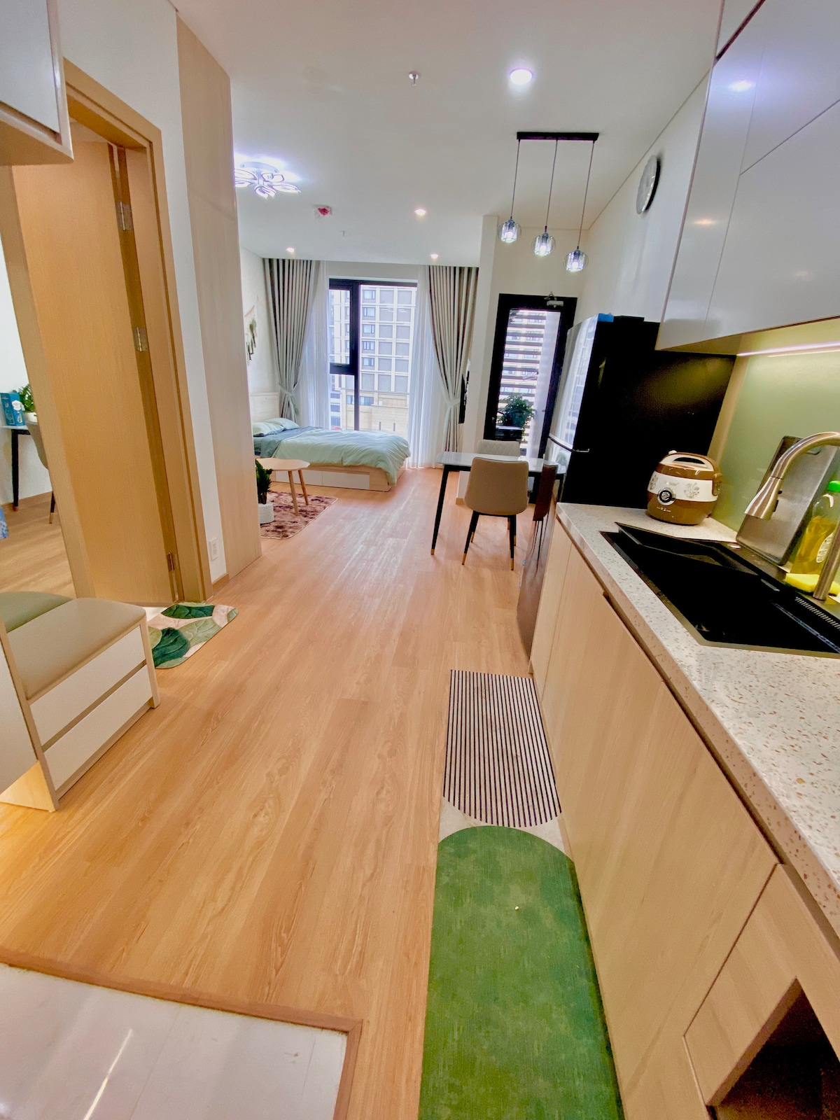 🌆 Hemvist på Sentosa Sky Park Condominium – Hai Phong 📍 Läge: Bui Vien Roundabout -Vuc Nguyen Giap, mittemot Nikko Hotel, nära Aeon Mall Hai Phong. 🏠 Rum: Studio 32 m² - lämplig för 1-2 vuxna: - 1 dubbelsäng, soffa, tebord, 2-vägs luftkonditionering, Netflix-projektor - Kök, mikrovågsugn, kylskåp - tvättmaskin 25:e 👀 våningen utsikt över floden + extremt lugn gata - 📢 om du checkar in tidigt eller checkar ut sent måste du betala en extra avgift