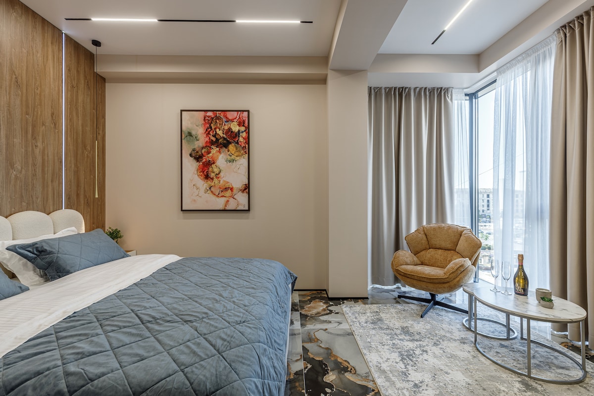 Koppla av i en elegant lägenhet i hjärtat av Chisinau, med marmor och naturträ. Du kommer att njuta av en premium Vi-Spring Bedstead-madrass, ett rymligt badkar och en balkong med en dekorativ öppen spis. Lägenheten har fjärrkontrollgardiner och en kaffeböns-espressomaskin Kvarteret har 24/24 reception och säkerhet, vilket ger dig extra säkerhet, komfort och sinnesro under hela din vistelse.