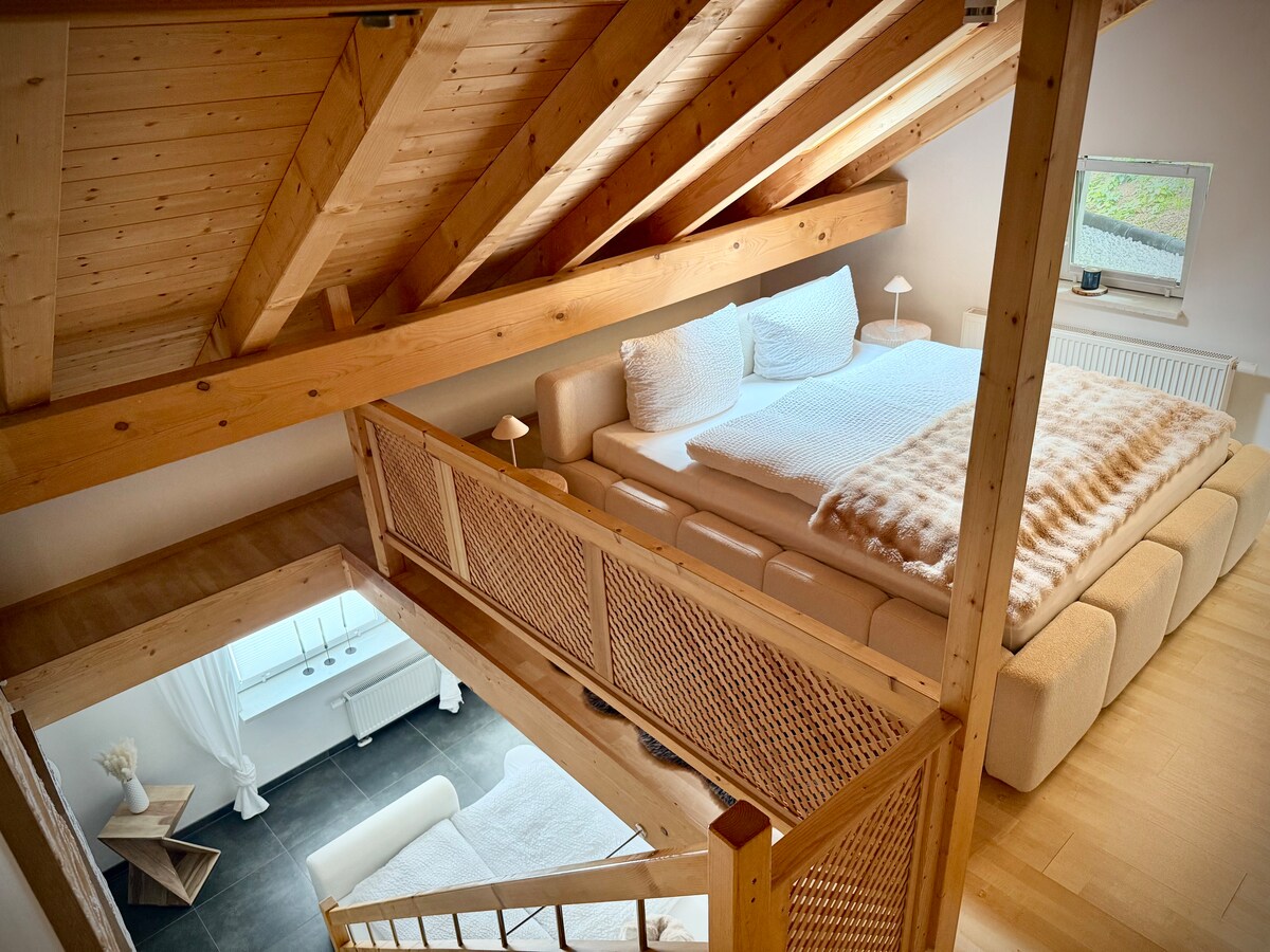 DAS ALPIENTE - Sedan januari 2017 hyr vi ut en mycket elegant, 90 kvm stor vindsvåning i vårt semesterhus i Allgäu. En atmosfär för välbefinnande - den speciella atmosfären i Alperna. Traditionella element integreras i ett modernt formspråk, naturliga material skapar mysighet, den högkvalitativa inredningen ger den goda känslan av att vara "hemma".