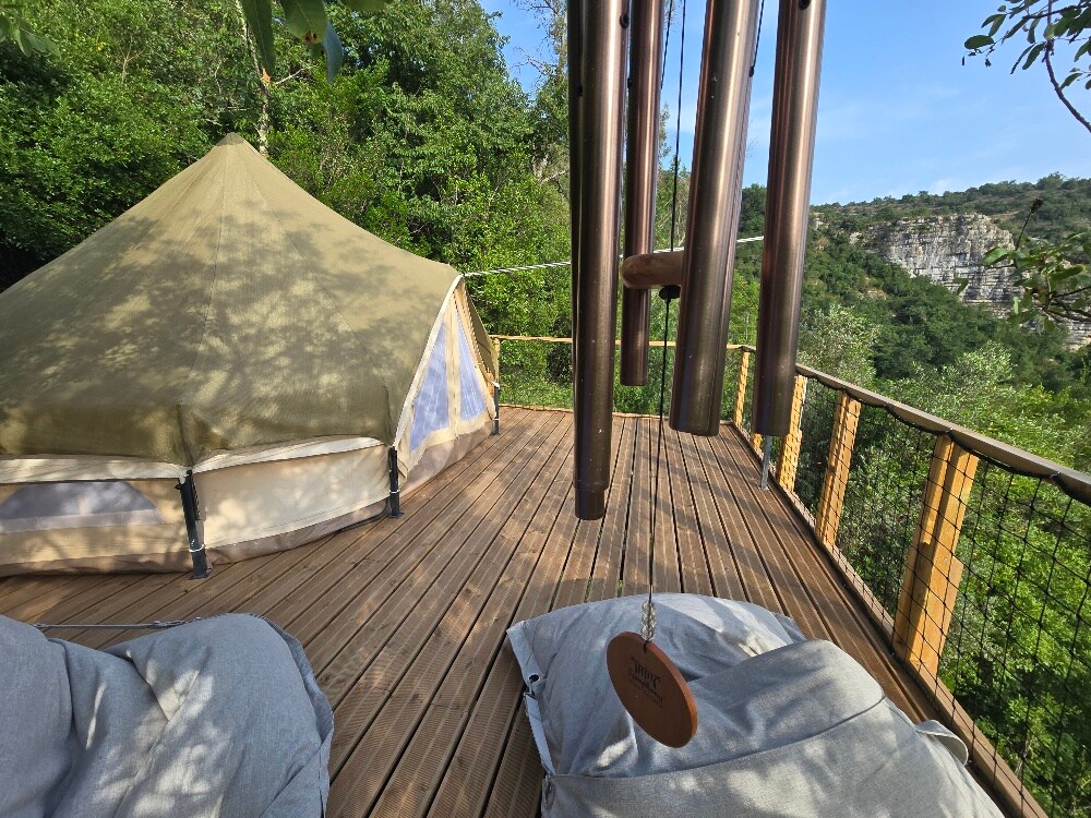 Mellan vatten, himmel och jord ligger vår webbplats i hjärtat av naturen i hjärtat av södra Ardèche i ett autentiskt och bevarat landskap. Lev upplevelsen av en stund av total frånkoppling, där du är inbjuden att varva ner och njuta. Du kan förbättra din vistelse med en yoga- och meditationsklass, tillsammans med din värd, en kvalificerad lärare, få en energivering eller en massage (ingår ej) Frukost kan också tas ut på plats på begäran. (10 €/pers)
