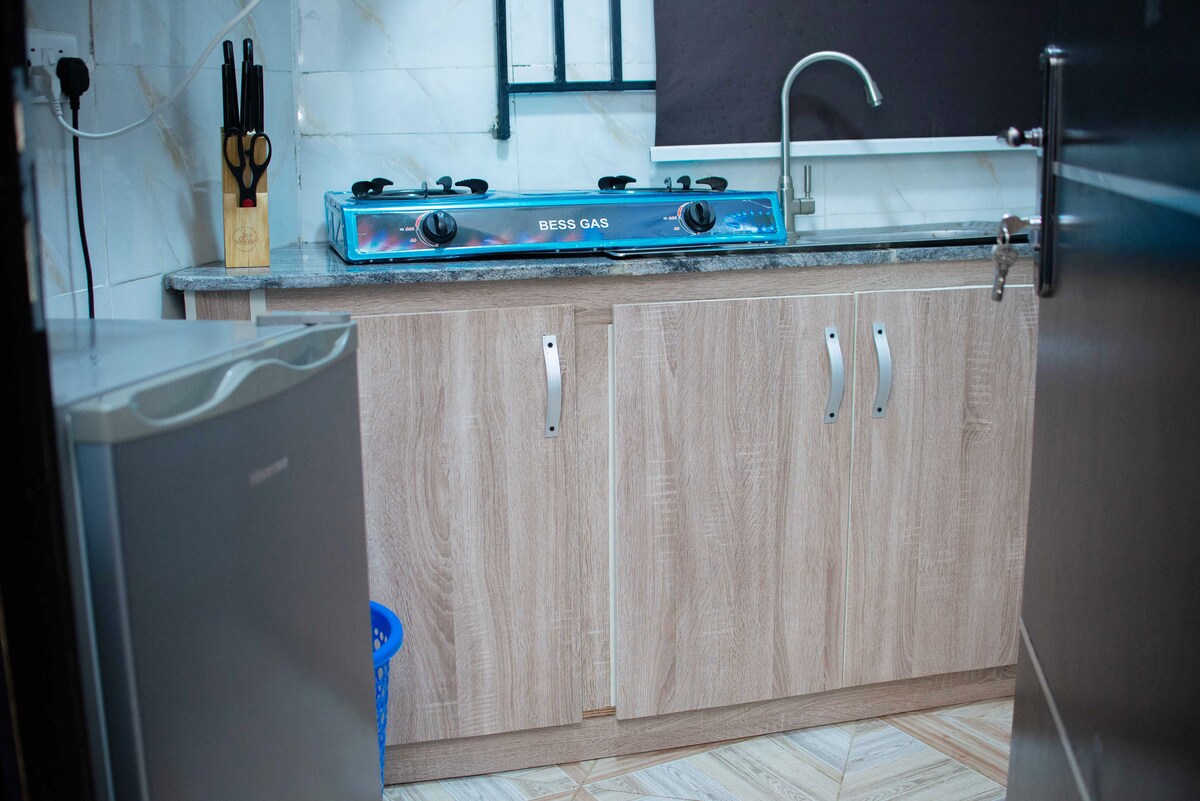 Välkommen till denna vackert designade lägenhet med ett sovrum, belägen på Toyin street ikeja, nära överallt. Den är fullt möblerad med moderna och sofistikerade bekvämligheter för att erbjuda dig en sömlös boendeupplevelse, denna lägenhet kombinerar elegans med funktionalitet, genomtänkt inredd med eleganta möbler, 65 tums Samsung QLED TV och samtida konst, perfekt för avkoppling och underhållning. En rymlig fristad med bekväm säng, fullt utrustat kök med toppmoderna apparater.