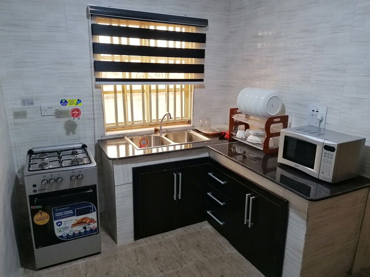 Rymligt vardagsrum och kungligt rum med Super king-säng, modernt badrum och toalett🚽. Väldigt ren och standardlägenhet. Royal Pent House ger dig all modern komfort utöver din fantasi med obegränsat höghastighets WiFi, 43 tumsmart TV i sovrummet och 55 tums Smart TV i vardagsrummet, YouTube, Netflix, DSTV. Bekväm soffa, varmvattenberedare, vattenkokare, mikrovågsugn, matlagningsgas. Brandvarnare, monodioxidlarm, ström dygnet runt. , Cctv, maximal säkerhet med säkerhetspersonal dygnet runt