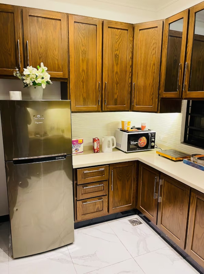 Vår 1 BHK Orbit Penthouse i DHA Phase 5 är där urban chic möter himmelsk cool. Tänk: en glödande månvägg för selfies sent på kvällen och ett djärvt konstverk med dollarstaplar som skriker "huvudpersonens energi" Vakna upp till parkutsikt från din privata balkonggunga, njut av dina favoriter på 50-tums 4K Smart TV, eller laga något estetiskt i det fullt utrustade designköket. Inredningen? Abstrakt, elegant och gjord för flödet. Dessutom är du precis intill Lahores hetaste matställen.