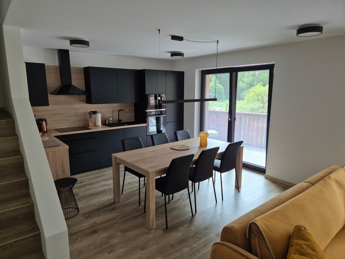 Ljus lägenhet — loft med en fantastisk utsikt över bergen, bara några minuter från sjön Bohinj. Svartvitt med något rött — som en tårta med ett körsbär på toppen :) Du kommer att känna dig som hemma och samtidigt kommer du att vara på semester. Läget erbjuder många vandrings- och cykelleder och det ligger nära skidorterna Vogel och Soriska planina och en vattenpark med wellness och bara några kilometer från sjön Bohinj, där du kan bada, surfa, paddla kajak, sup... och njuta av naturen.
