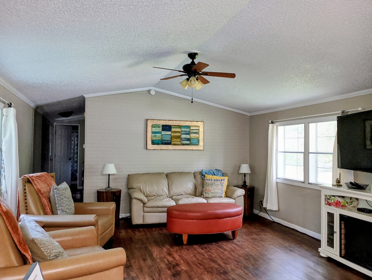 Njut av charmen av modernt och vintage i vår nyligen uppdaterade stuga. Mysig men öppen planlösning med stora fönster och uteplatsdörrar gör att du kan njuta av den fridfulla utsikten över vattnet och djurlivet precis utanför din dörr. Vårt loft på övervåningen har 2 sängar och fungerar som vårt tredje sovrum. På nedervåningen finns ett fullt utrustat kök, rymlig matplats, vardagsrum, två sovrum med gott om garderobsutrymme, en tvättstuga med tvättmaskin och torktumlare så att du kan njuta av alla bekvämligheter som ett hem ska ha.