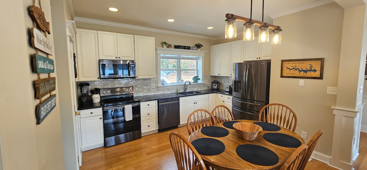 Koppla av och ladda om i vårt anpassade hem vid sjön 1 min till vattnet, beläget i en stor lugn vik på Poplar Creek precis utanför huvudsjön (Mile Marker 14 av 34). Endast 90 minuter från Raleigh, NC eller Richmond, VA! Öppet koncept huvudvåning, fullt utrustat kök, gott om sittplatser. Master på huvudvåningen, 4 sovrum på nedervåningen, 2 med utsikt över sjön. Rekrum med pingis, TV, våt bar. Höghastighetsinternet via fiber. Stort båthus med bar, WiFi, 4 kajaker, liten fiskebåt med trollingmotor, eldstad, cornhole