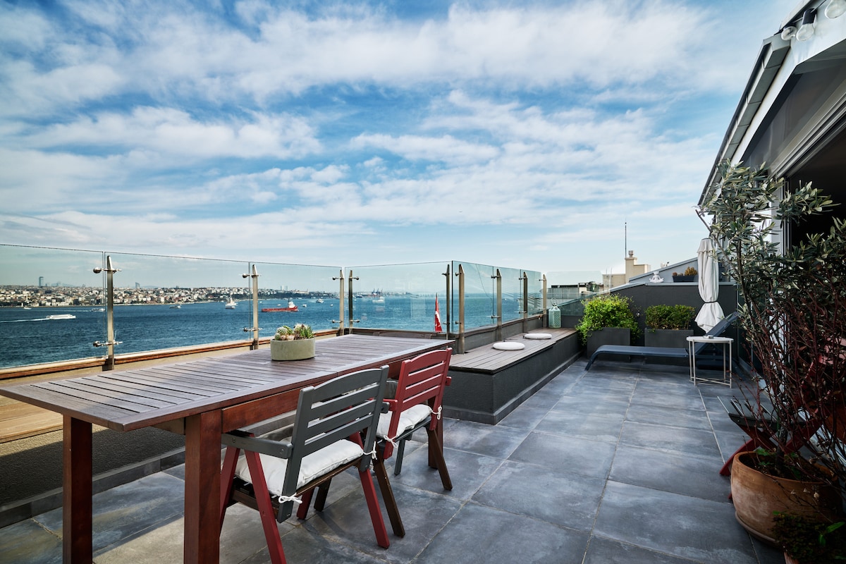 Den bredaste vinkeln av Bosporen i Istanbul! Njut av att titta på kryssningsfartyg, historiska och ikoniska byggnader allt i en vy i denna lyxiga Duplex. 3X Bästa utsikten tilldelad. Gångavstånd till Galataport, Oldtown och många restauranger. Det är långt från bullret, centralt, beläget i elitdelen av staden. 2 minuter till spårvagn, taxistation och färjor. Precis nära havet och 7 minuters promenad till Taksim. Det är ett av de största husen i Cihangir. Restauranger och marknader som serverar dygnet runt