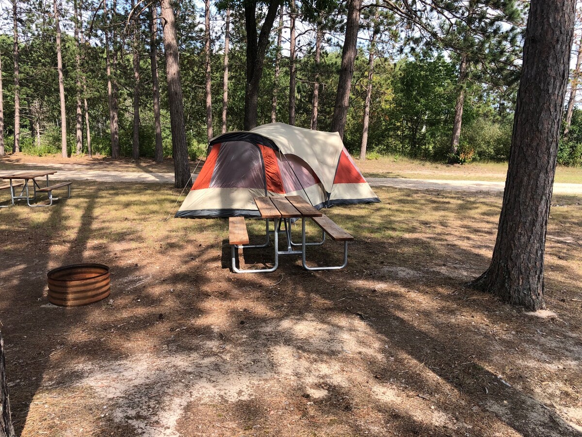 Kom bort från allt när du bor under stjärnorna. Morel Svamp på våren, höstfärg vacker vid sjöstranden. Se prärievarg, rådjur, kalkon, andra vilda djur. Njut av vandring i North Country Trailhead bara 8 miles bort, kanotpaddling, ATV-leder inom 4 miles. Endast 20 minuter från Lake Michigan, 25 minuter till Ludington och Manistee. Caberfae skidort 20 minuter bort. Tältet och utedass och duschhus och campingplats helt nytt. Mitt mål är att ha alla campingartiklar tillgängliga för dig.
