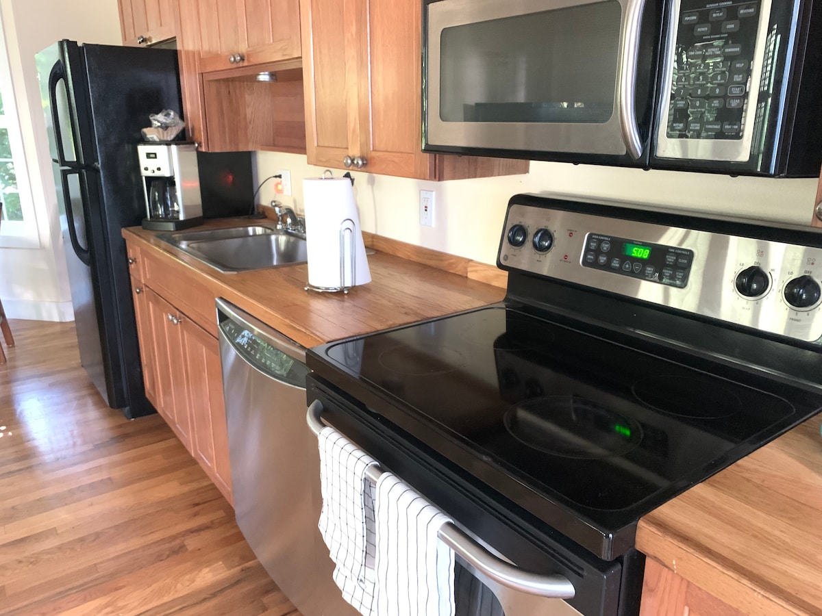 Studion har en queen size-säng utrustad med fullt utrustat kök och badrum samt arbetsområde med wifi och HBO, Showtime. Den har separat ingång och ligger i ett avskilt kuperat område. Det finns 8-9 steg till enheten och kanske svårt för vissa gäster. Tvättmaskin/torktumlare finns i huset, gäster kan kontakta oss om de vill använda. Under en vinter snö/isstorm kan vårt läge vara utmanande. Du kan behöva avboka eller ändra din bokning i enlighet med detta om det finns snö-/isstorm.