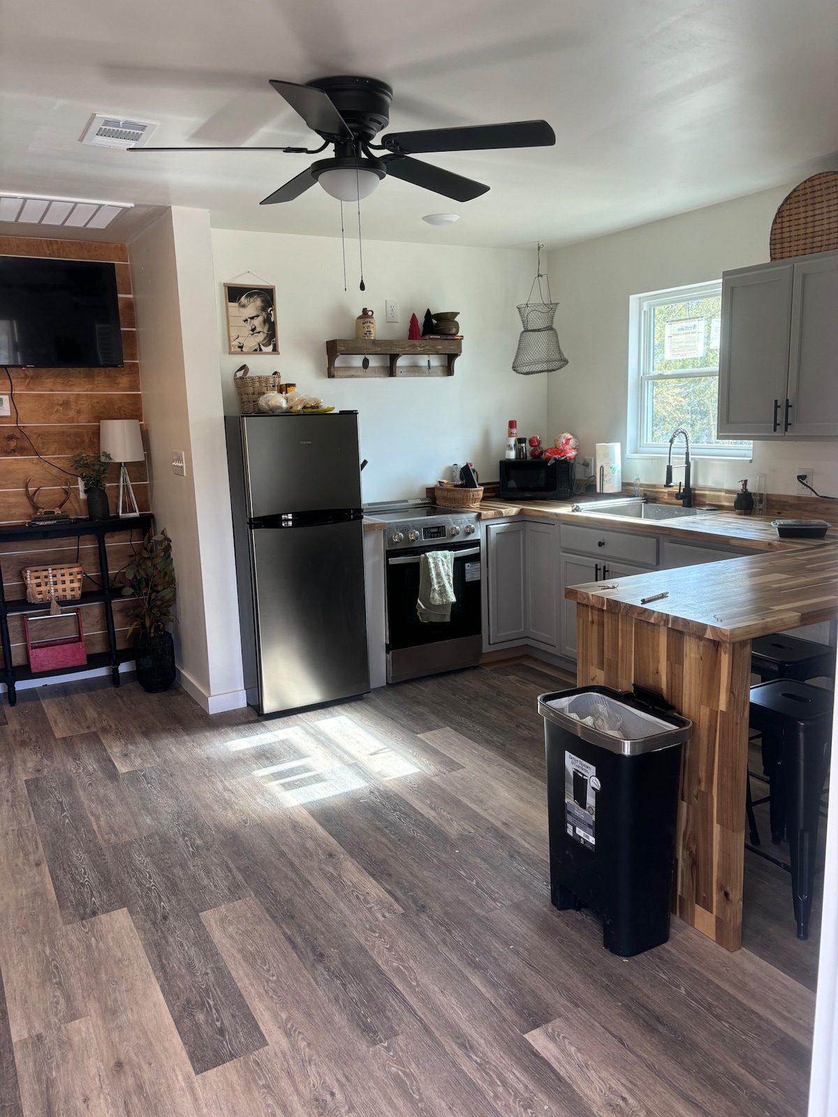 Relax with your entire family or group at the peaceful Green Haven. A perfect blend of privacy and common area comfort for your entire group awaits you! We have taken special steps to insure you have everything you’ll need to enjoy a comfortable and relaxing stay. Three dedicated work stations along with USB charging stations located in the lamps and receptacles in every room for your convenience. Enjoy a full kitchen with all the small appliances you need and a fully stocked bathroom.
