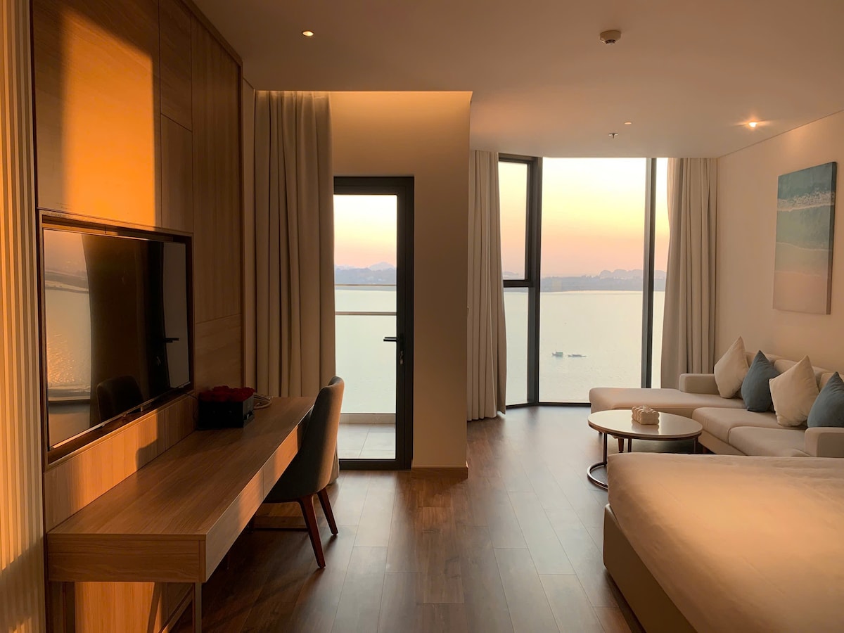Beläget intill InterContinental Halong Bay Resort, denna 45 kvm fullt möblerade Studio med fantastisk havsutsikt över Ha Long Bay från det höga golvet. Det är mycket bekvämt med full service för avkoppling och underhållning och mat till exklusivt pris för gäster som bor här och perfekt på den vackra stranden. 🏊♂️Observera att rumspriset inte inkluderar pool, jacuzzi, gym, spa och frukost som hanteras av 5* à la hotellet. Du kan köpa biljetter i receptionen till boendes pris.