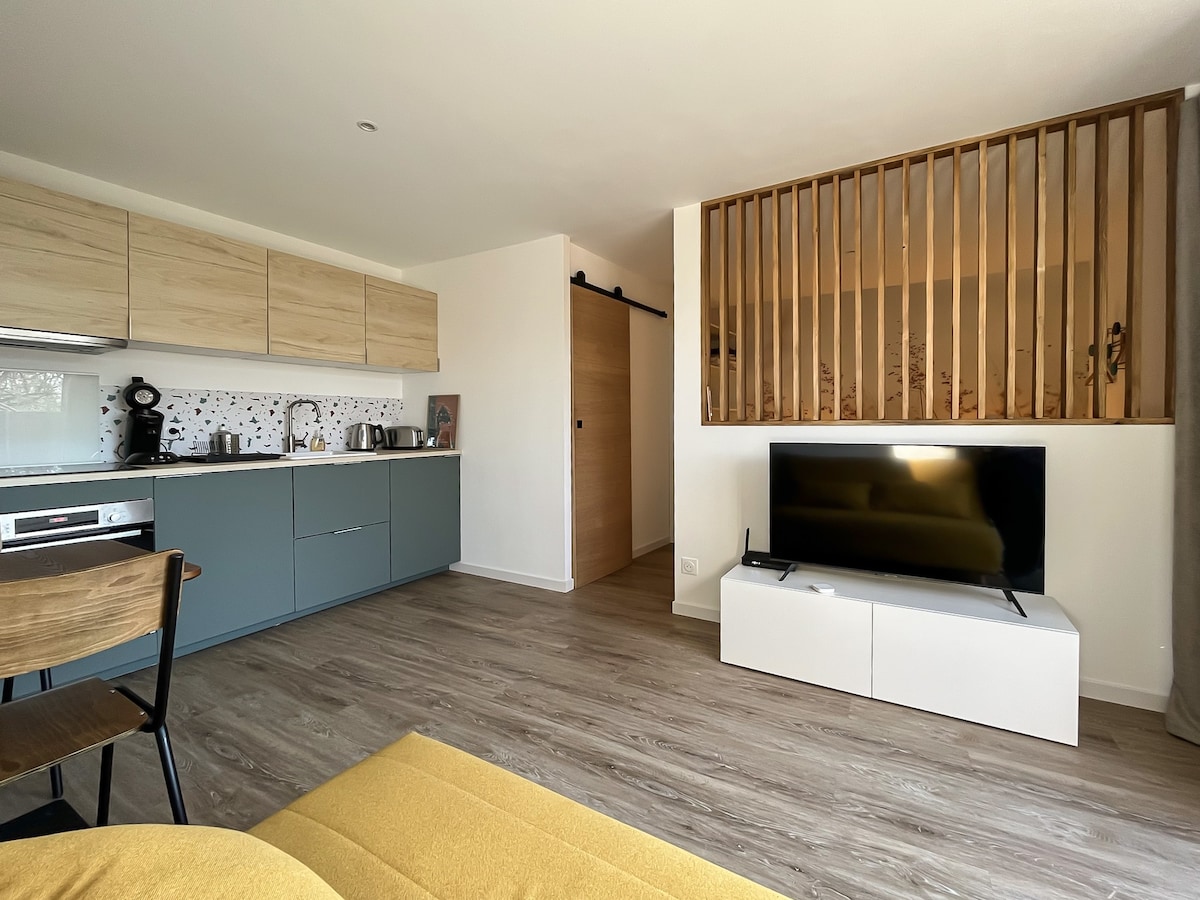Oberoende studio 22 m², luftkonditionerad, med ett kök utrustat med en brödrost, en kaffebryggare, en vattenkokare, en ugn/mikrovågsugn och allt du behöver för att laga mat! Det finns en TV och Wi-Fi. Den har en trädgård utan motståndare, bestående av en träterrass för att äta, en grill med allt du behöver, 2 solstolar, och en cykelställning. Det finns också möjlighet att parkera en motorcykel i stället för cykelstället. Trädgården är säkrad med en grind som kan låsas med nyckel!