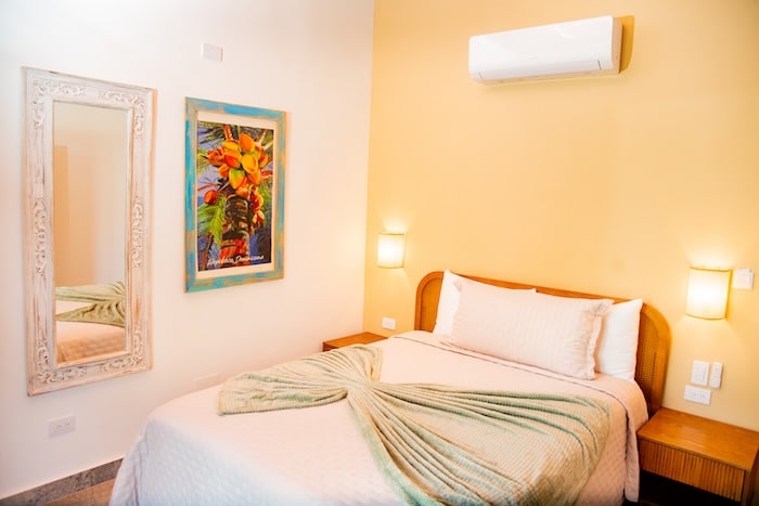 Escape to paradise at our newly renovated, spacious boutique hotel. Our eco-friendly hotel is steps from the beach in the heart of Las Terrenas! Wake up to stunning ocean views, unwind by our luxurious three-tiered pool surrounded by palm trees, or feel the ocean breeze as you relax in the sun. With tropical serenity, modern luxury, and the beach just minutes away, your perfect getaway awaits! The Suite Includes a king size bed, ensuite bathroom, and air conditioning.