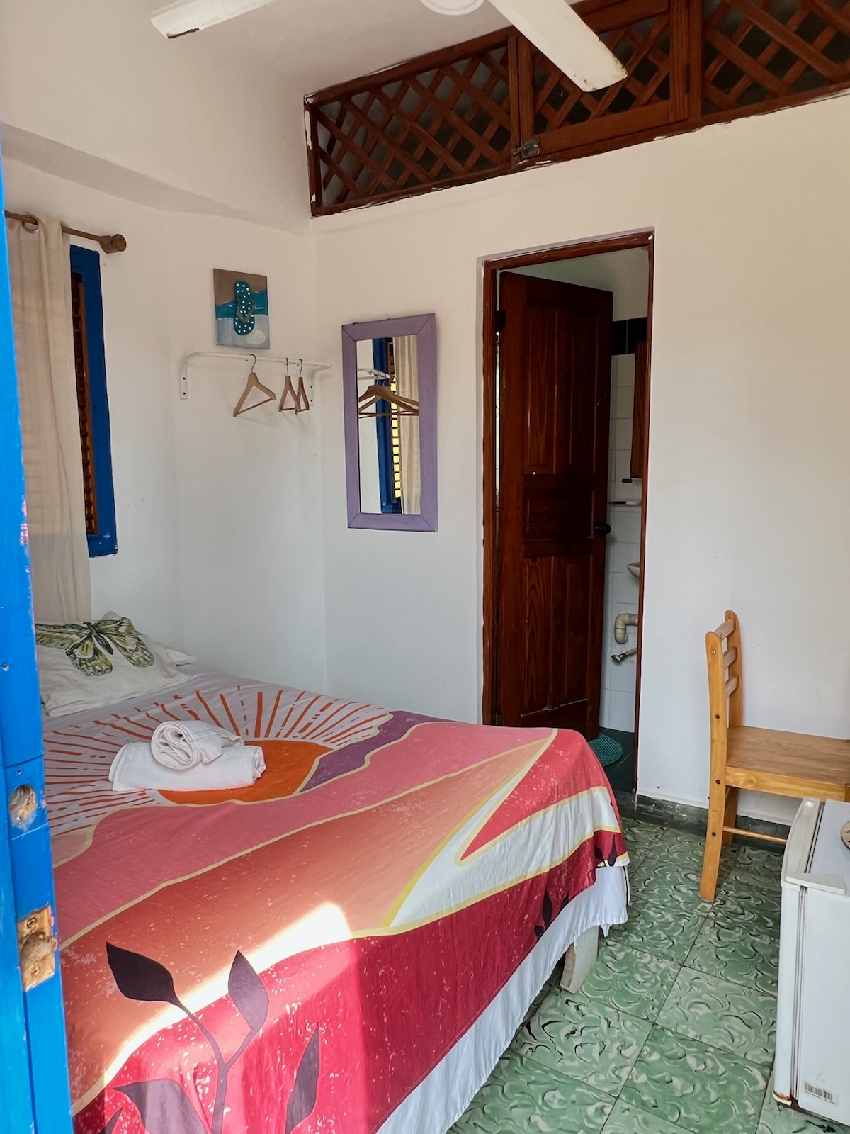 Small room at Casa Delfín (12 m²), ideal for one person. Please note that if you are taller than 6 feet (1.83 m), the space may feel a bit tight. This is a budget-friendly room with a private bathroom—not a 5-star hotel experience—and the pricing reflects this. Perfect for guests who value simplicity, location, and great value.