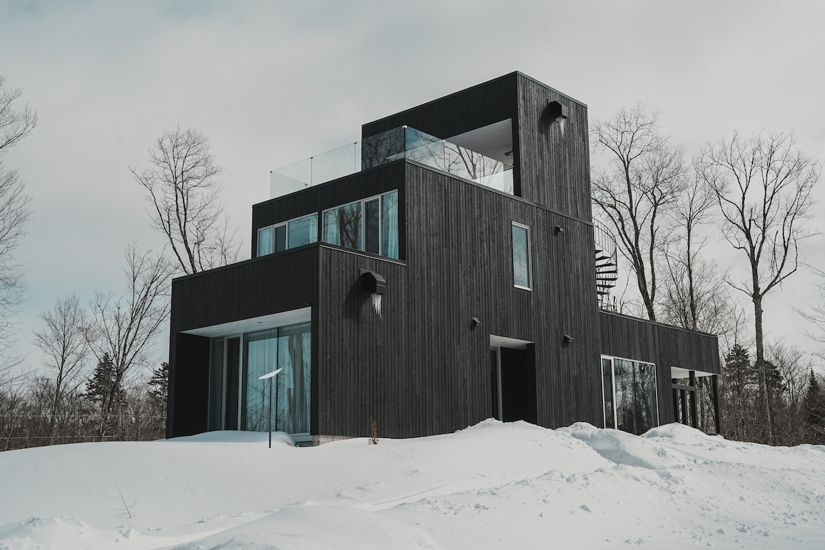 Vår nordiska skogstuga är perfekt för att tillbringa kvalitetstid som ett par (eller med ett barn), eller för en arbetsplats (med höghastighets WiFi). Träinteriören är varm och mysig. Fönstren i full höjd erbjuder fantastisk utsikt över en skogbevuxen dal. Det öppna köket och vardagsrummet håller dig i samtalet när du lagar mat. Om du föredrar att laga mat utomhus finns en eldstad med grill och matbord utomhus. Endast 70 minuters bilresa från Montreal. Sjön ligger 25 minuters promenad bort om du parkerar i närheten.