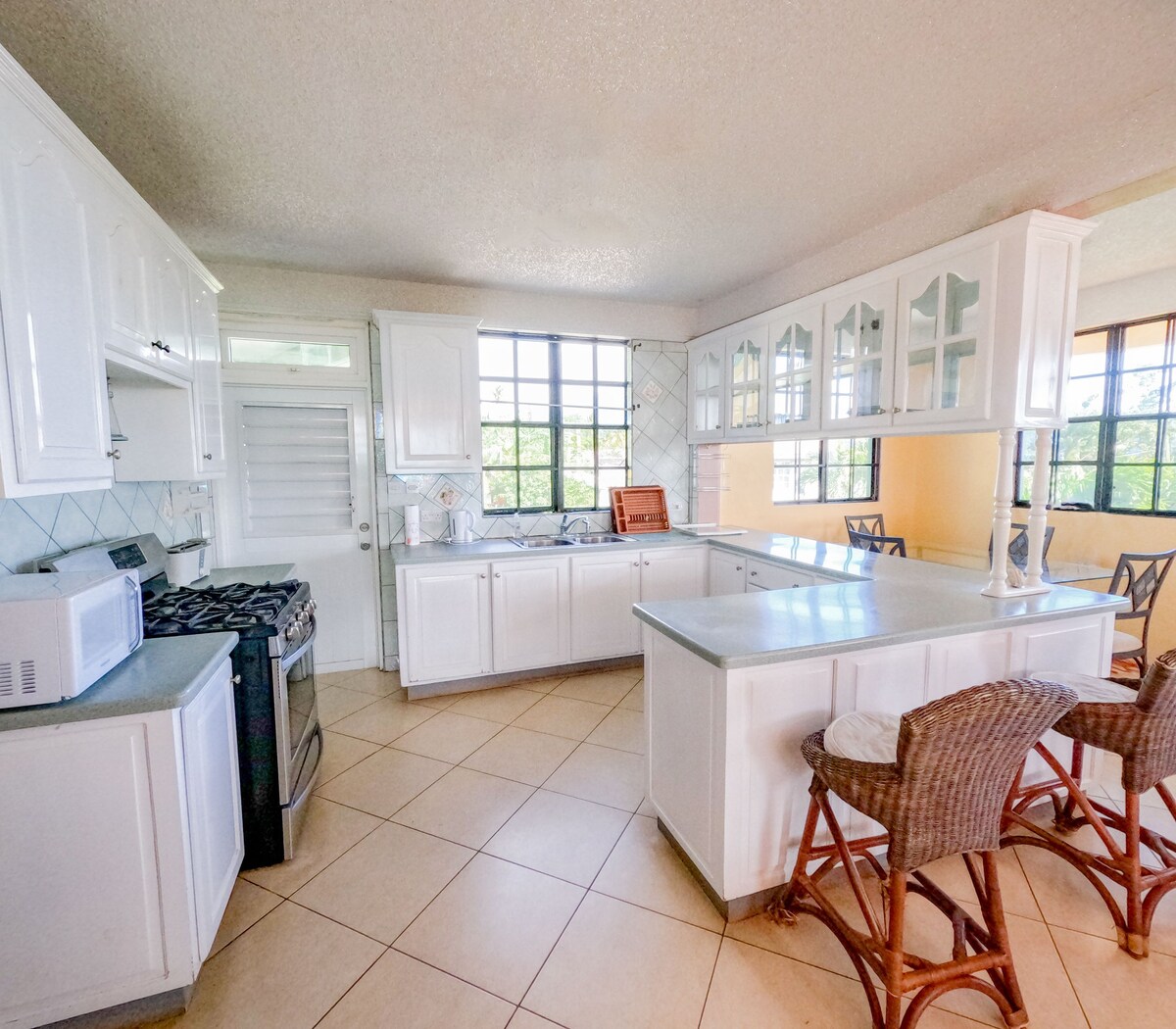 Njut av denna centralt belägna 2BD/1BR apt med vacker utsikt över Karibiska havet. Lägenheten har gratis WiFi, ett bra rum med en platt-TV, soffa och fåtöljer för dig att koppla av tillsammans med ett fullt utrustat kök. Huvudbrädan har en king size-säng med en säng i full storlek i 2: a BD. Soffan gör det möjligt att lägga till sovplatser. Beläget på höjderna är det väl ventilerat. Lägenheten är helt för dig. Ät eller sitt på terrassen och njut av solnedgången varje kväll!
