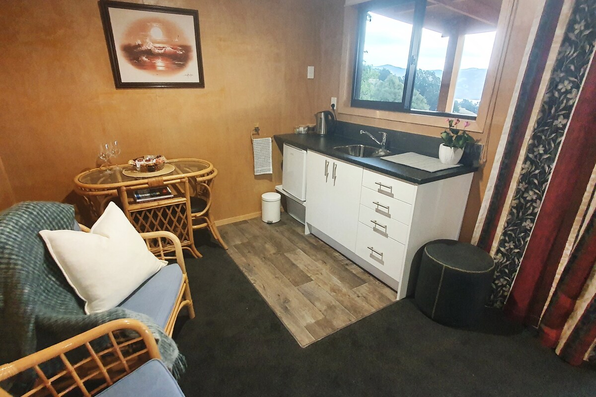 En privat, lugn tillflyktsort med fantastisk havsutsikt och rikligt fågelliv. Bara en kort bilresa från Akaroa kommun (3 km) och inbäddad i inhemsk buske, belägen på 3 hektar med utsikt över Akaroa hamn. Vårt queen-rum är anslutet till vårt hem och är lämpligt för självständiga vistelser. Njut av havsutsikt från ditt rum med separat ingång, eget badrum, gratis wifi och SkyTV och privat användning av en gemensam utomhus spa pool. Observera: inte lämpligt för barn under 12 år. Acceptera högst 2 nätter.