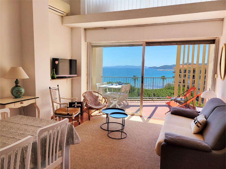 I ett litet privat boende med privat pool och tennis och utan trafik, Studio-mezzanin på 1:a våningen med 1 sovrum och hörnterrass med 180° panoramautsikt över havet. Perfekt för familjer med barn (4 personer). 1 sovrum + 1 mezzanin, kök, vardagsrum, badrum. Allt går att nå till fots: pool, hav, tennis, shopping, bröd, restauranger ... Ingår: Lakan och handdukar, wifi, madrass för stranden, pool, tennis, parkeringsplats ...