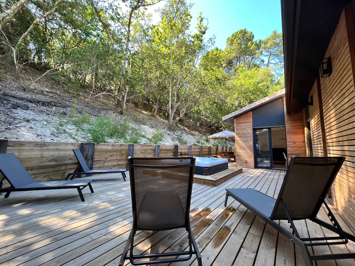 Vid skogsbrynet, uthyrs villa T4 med SPA 6 platser vid dynan. Detta nya hus, med luftkonditionering, ligger 7 km från Lacanau Océan och 250 m från sjön, vilket gör att du enkelt kan njuta av alla aktiviteter som vår vackra kust kan erbjuda.