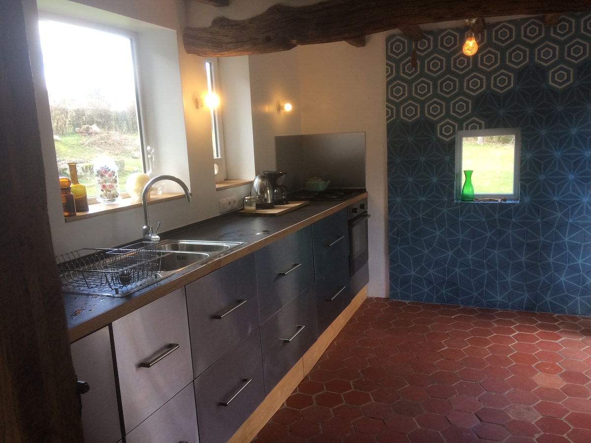 Bekväma, mysiga, extremt tysta och charmiga två sovrum, sovplatser 6, 125 kvm - helt renoverad 2014 - traditionell normandisk gammal "longère" stuga, inga direkta grannar, 1 ha privat trädgård och tillgång till 10 ha ekologiskt reservat, inbäddad i blommor och gröna ängar. Handikappanpassad, skorsten, barn och hundvänlig.