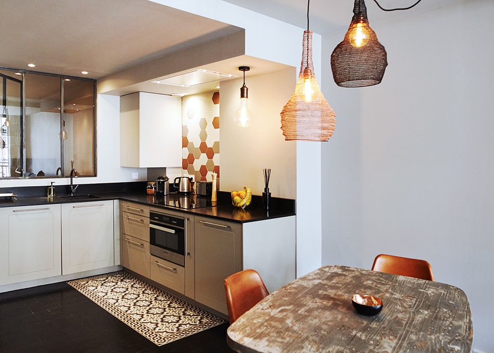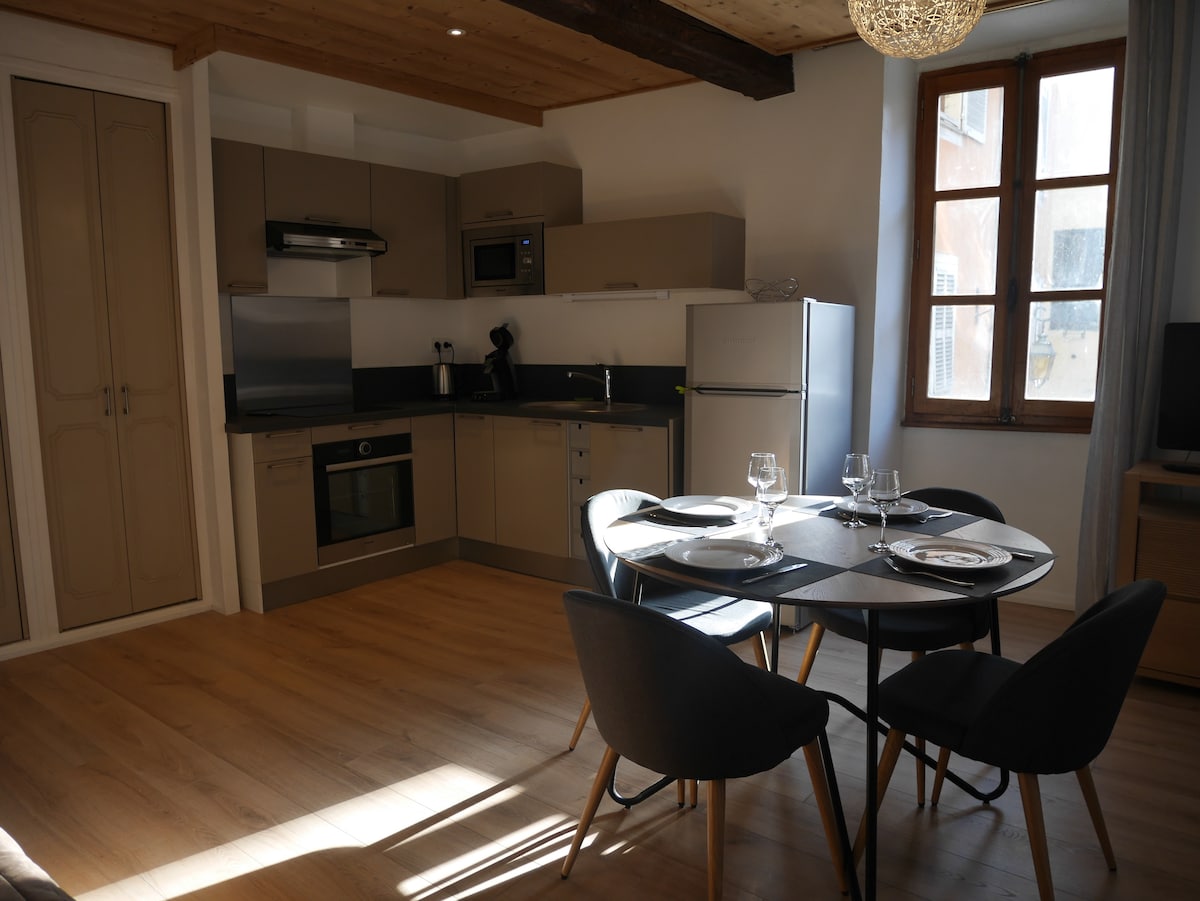 En exklusiv adress i hjärtat av gamla stan i Annecy, denna intima kokong som kombinerar diskretion och lugn ligger på första våningen i en gammal byggnad. Entrén öppnar upp till ett stort vardagsrum upplyst av stora fönster. Den består av ett kök med rena linjer och ett mysigt vardagsrum. Sovrummet som ligger på en plattform har utformats som ett hotellrum med ett angränsande badrum. Det finns också en vägg-TV i sovrummet.