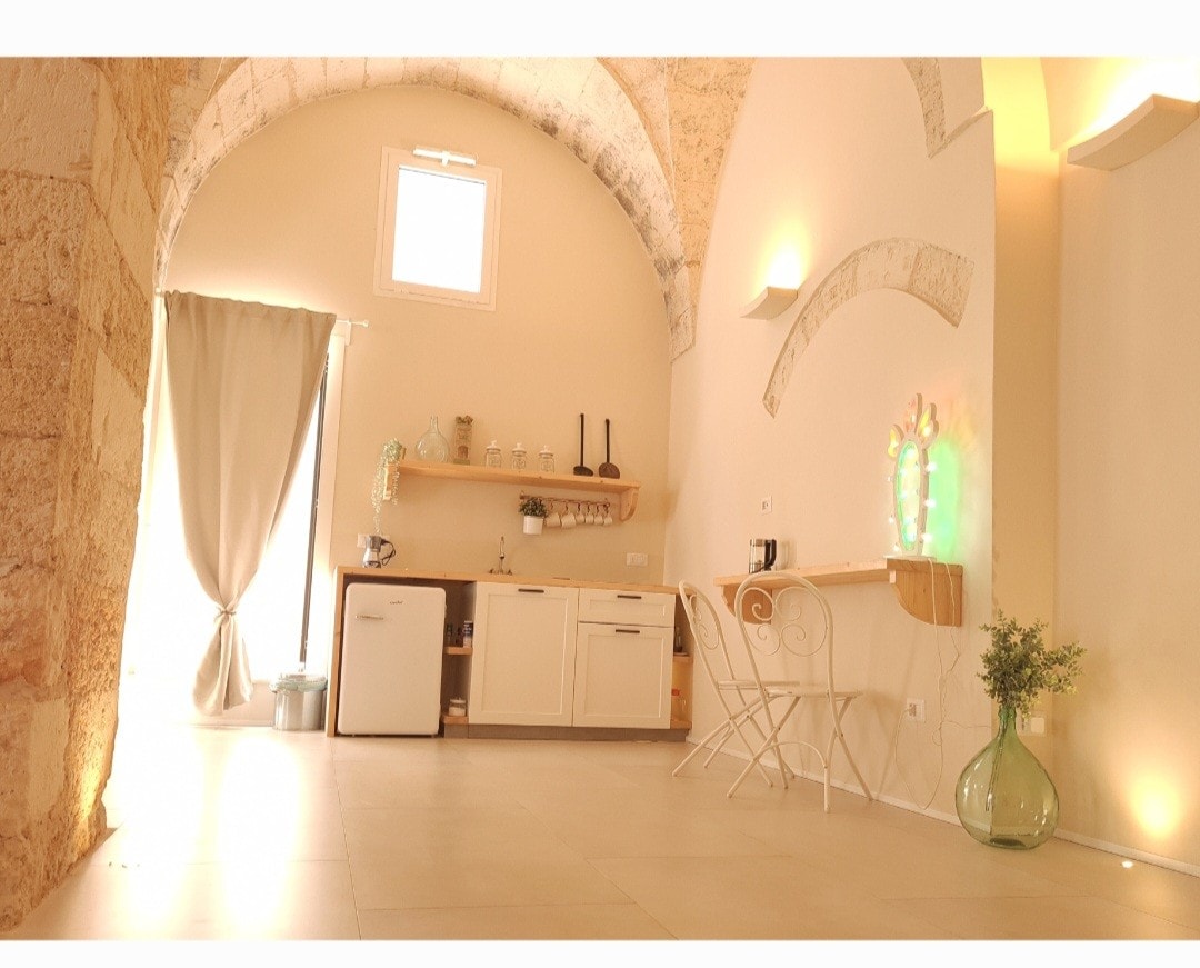 En rymlig och välventilerad vindsvåning belägen på bottenvåningen i en 1700-talsbyggnad, mitt i den charmiga historiska staden Carpignano Salentino, nära Otranto i Apulien, Italien. De höga stjärnformade välvda taken och de traditionella möblerna i Salento-stil skapar en atmosfär som tar dig tillbaka i tiden. Vi tillhandahåller frukostvaror för gästernas bekvämlighet, även om själva frukosten inte serveras.