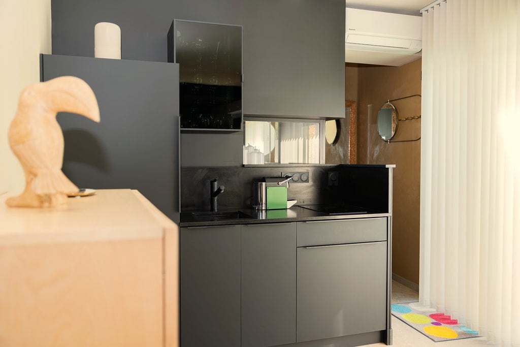 Julies studio var vårt studentdotters bostad. Efter ett års arbete (isolering, omorganisation och inredning) blev det vår bas i Angers när vi åkte med tåg tidigt på morgonen. Och vi är glada att dela den med dig i denna nya konfiguration. Den är ljus och färgstark, fullt utrustad och helt oberoende. Grannskapet är mycket livligt och centralt men studion är extremt lugn eftersom den vetter mot en innergård.