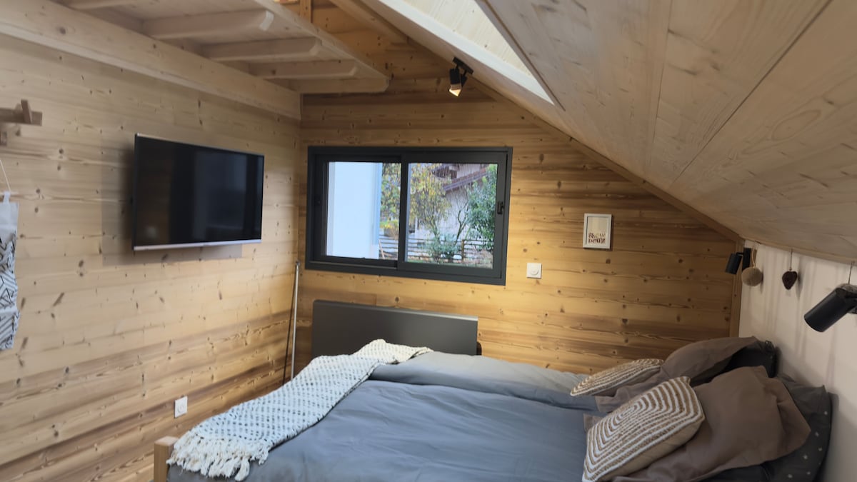 Mysigt trähus, urval av kvalitetsmaterial och utrustning. Mycket lugn miljö, stor terrass (27 m²) med utsikt över ekologisk trädgård. Komplett utrustning: Kingsize-säng, alla hushållsapparater tillgängliga. Dusch i italiensk stil, små hushållsapparater av hög kvalitet. Trädgårdsmöbler, grill. Genève 15 minuter, Annecy 25 minuter, Chamonix 45 minuter, Yvoire och Genèvesjön 30 minuter, Glières-platån 20 minuter nära skidorter. Varierad frukost. Wifi. Parkering.