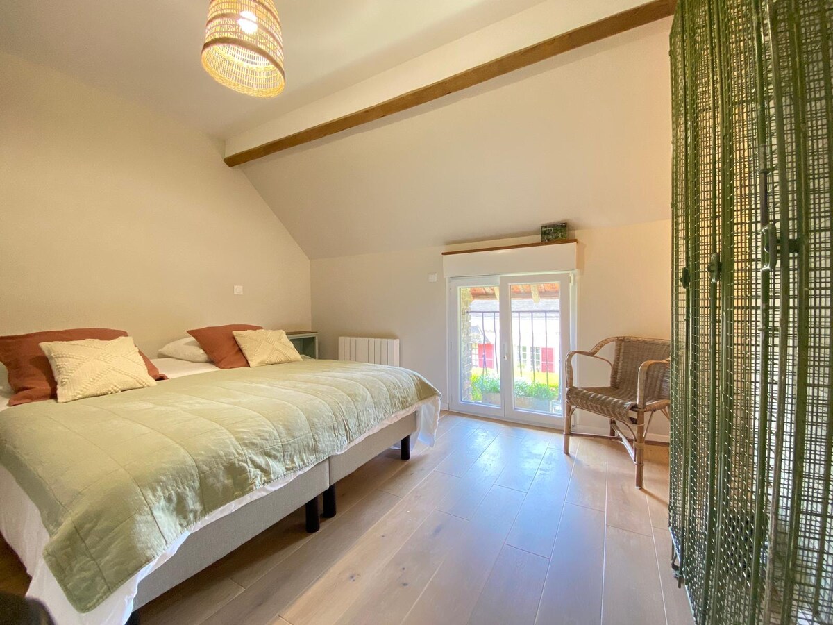 Boendet Lägenheten ligger på 2 våningar med 2 sovrum i rad. Perfekt för ett par med barn. Tillträde sker via en yttre trappa som leder till en terrass med utsikt över den privata trädgården med utsikt över kyrkan St Denis. Lägenheten har på 1:a våningen ett stort vardagsrum med en matplats i anslutning till det amerikanska köket, ett vardagsrum med en vedspis, ett duschrum och separat toalett. En inre trappa leder till 2 sovrum i rad på övervåningen.