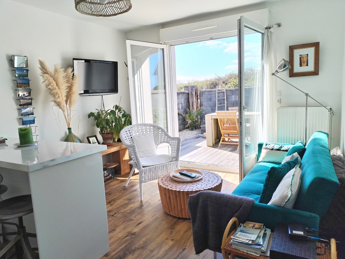 Du kommer att leva i takt med havet och tidvattnet. Vi erbjuder en vistelse 50 meter från stranden i en mysig lägenhet på 30 m2 helt renoverad, en kokong för att möta och njuta av den jodiserade luften från frukost på terrassen mot söder. Vi brinner för loppmarknader, inredning och gör-det-själv, och vi gör ständigt förbättringar för att dela en uppfriskande och bekväm upplevelse med dig.