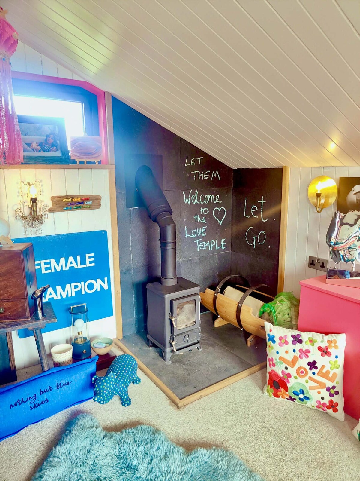 Deliciously off-grid and elemental, this bothy sits in open wilderness at the foot of a mountain, with long views down to the sea. Inside, colour and craft meet comfort: a king size bed, a dining and seating area, with a fully equipped kitchen and wood-burning stove. The spacious bathroom holds a deep tub to enjoy together and walk-in shower. Artwork, ceramics and finds from our travels surround you creating a sense of playful, secluded luxury. Outside, enjoy a fire pit & BBQ, under the stars.