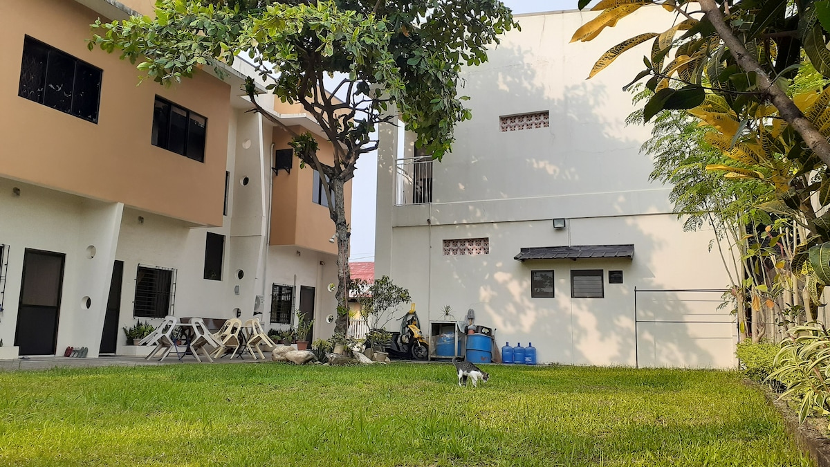 Njut av ett privat, luftkonditionerat sovrum med en bekväm queen-size-säng och ett angränsande privat badrum med varm dusch Boendet inkluderar tillgång till två fullt utrustade kök och två rymliga vardagsrum, alla delas med andra vänliga gäster. 📍 Lägeshöjdpunkter: Bara 5 minuter till själva staden Endast 200 meter från Sabin Hotel 150 meter från Martha's Restaurant 100 meter till stranden 🚴♂️ Enkel transport: Enkel åtkomst med lokala transporter som trehjulingar