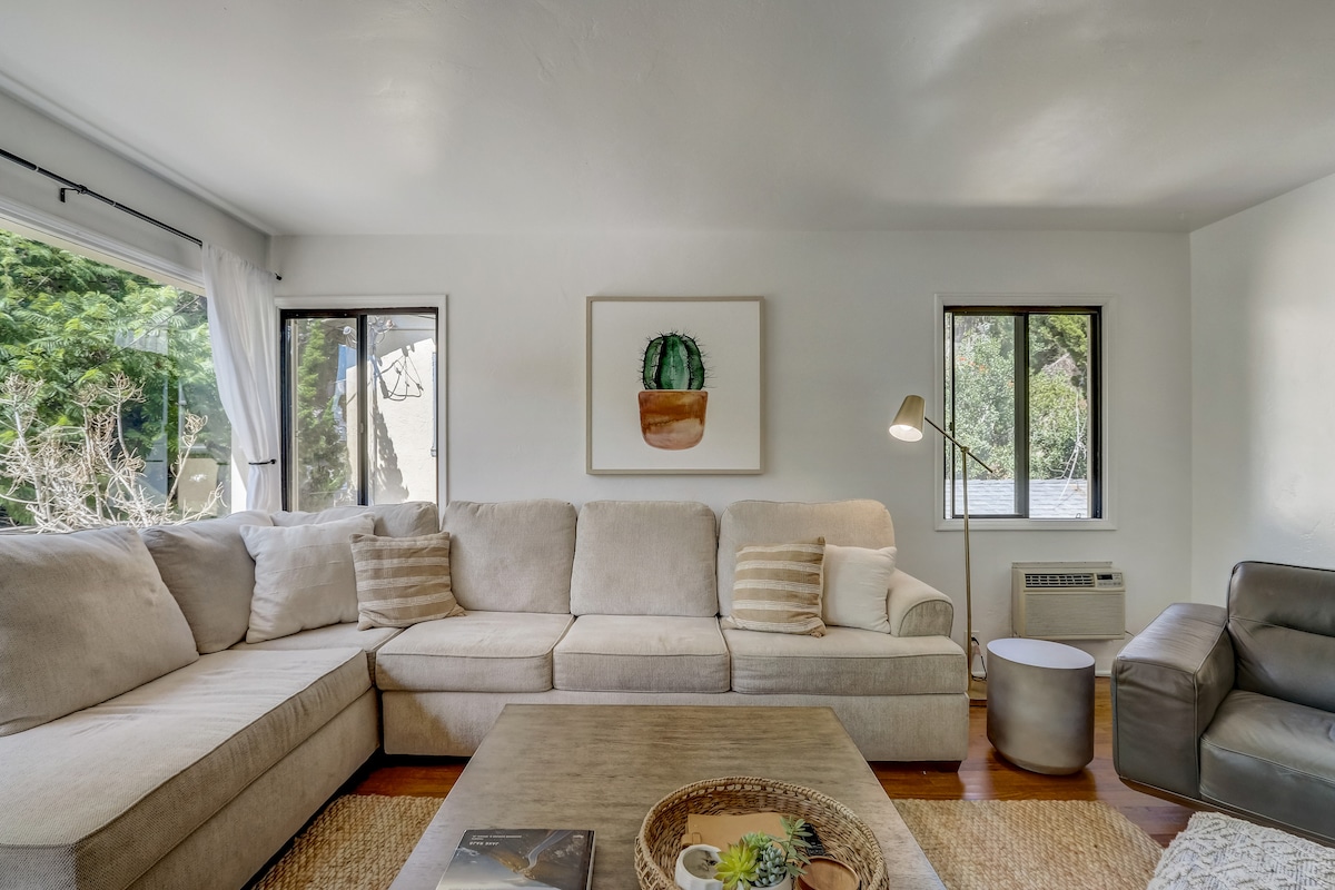 *KOLLA IN VÅRT ANDRA AIRBNB* Res 16 steg uppför en grekiskt inspirerad böjd trappa med 2-våningshöga väggar till din undangömda stuga byggd in i bergsvillan Alta Colina. Med spektakulär utsikt, kliv ut på balkongen för att se flygplan lyfta och båtar segla runt hamnen. Avsluta natten framför din avskilda bakre uteplatseldstad eller klättra uppför trappan i din spiraltrappa till jacuzzin på taket. Europeisk-inspirerad design och detaljer, det kommer att bli svårt att tro att du fortfarande är i San Diego!