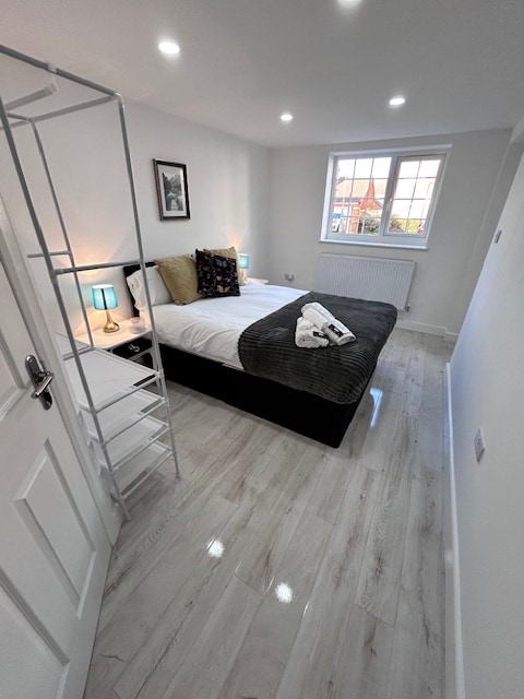 Rymlig modern studiolägenhet på lugn bostadsväg. Bra läge för att utforska det omgivande området med massor av landsbygds promenader på tröskeln och bekvämt gångavstånd till byns butiker och transport. Snyggt badrum och kök. Super kingsize-säng. 4k Android 43" TV och soundbar. Gratis WiFi. Elektrisk vedspis och elektrisk radiator. Offroad parkering. Lägenheten ligger i anslutning till vår fastighet så vi finns till hands om det behövs men är separat från vårt hus så buller är inte ett problem.
