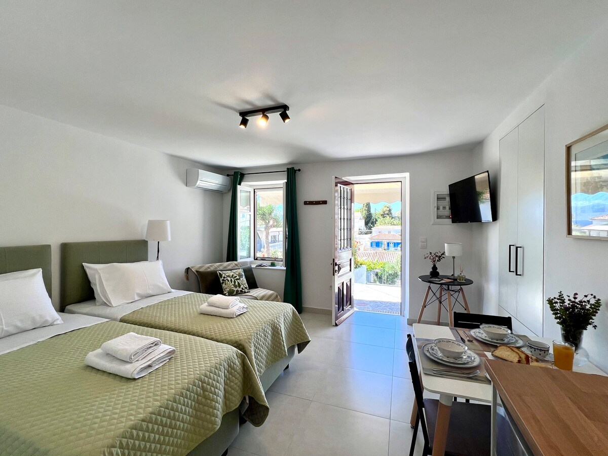 Studion är en del av ett större traditionellt gammalt stenhus, fullt renoverat och med fantastisk utsikt över hamnen. Man når husen på 10-15 minuters promenad (och trappor) från hamnen beroende på varje persons takt. Hydra är amfiteateriskt byggd och det finns många kullerstens trappor runt staden och leder upp till huset så...inte för alla! ny obligatorisk statlig avgift har införts: "Climate Crisis Resilience Fee", som uppgår till 8 euro per natt för korttidsboenden