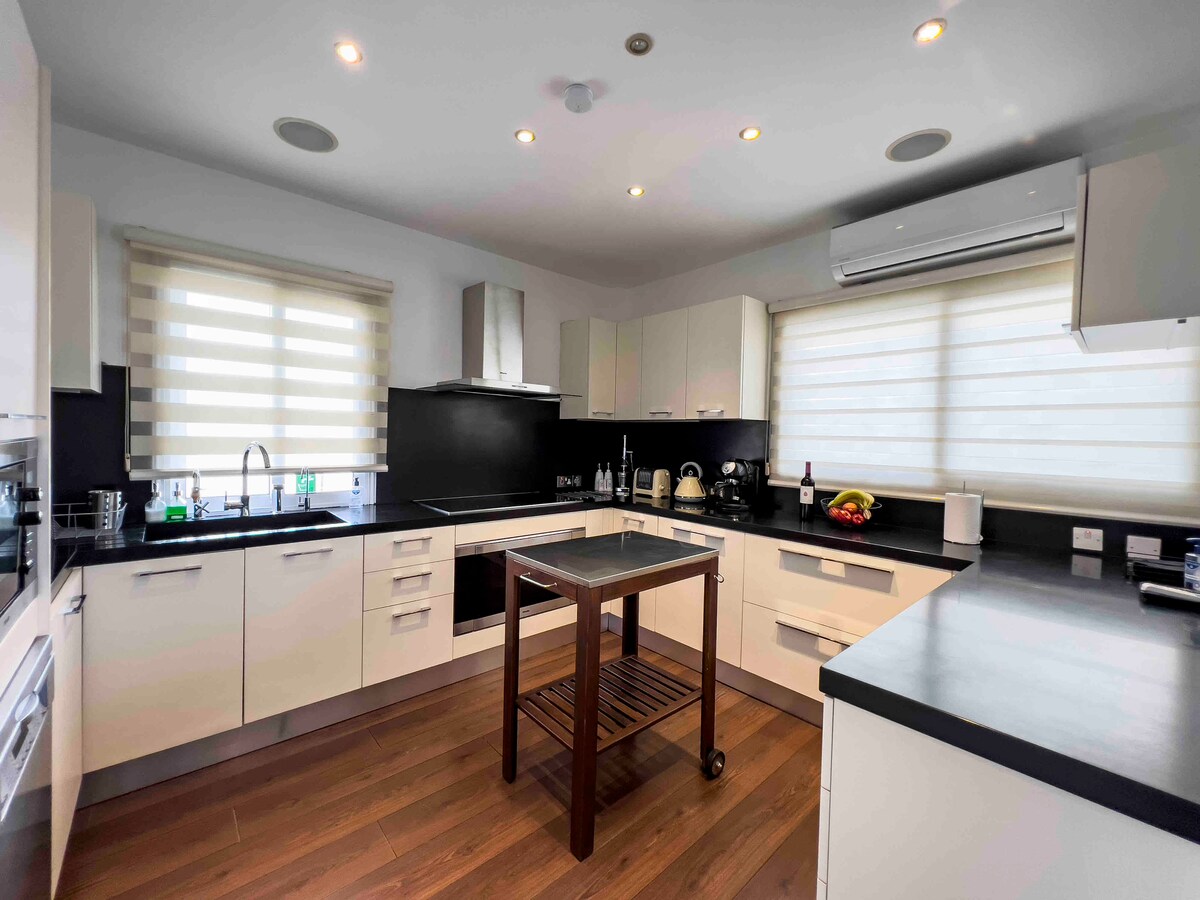 ** Renoverat lyxigt hus vid stranden med förstklassiga bekvämligheter** Bo i vårt boende vid stranden, perfekt för familjesemestrar och ö-äventyr. Perfekt för fitnessintresserade med ett privat gym. Koppla av i hamamet och bastun. Njut av matlagning i 2 kök, med hjälp av gasolgrillen eller samlas runt eldstaden. Bara några steg från stranden och nära till restauranger och underhållning, vårt rymliga vardagsrum och utomhusområden gör det perfekt för en minnesvärd familjesemester!