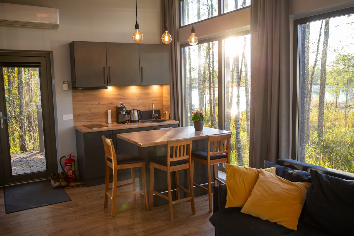 Skapa nya minnen i detta unika och familjevänliga boende. Stugan är en studio, perfekt för 2 personer, men också för familjer med barn och sällskap av vänner upp till 4 personer kommer att vara bekväma att bo här. Stugan har en privat bastu, det ingår i priset på vistelsen utan tidsbegränsning. Det finns ett utomhusbubbelpool på terrassen för extra kostnad 50 euro, även lämplig för barn. Badtunnan kan beställas så länge utomhustemperaturen inte är mindre än +5 grader, i kallare väder erbjuder vi den inte.