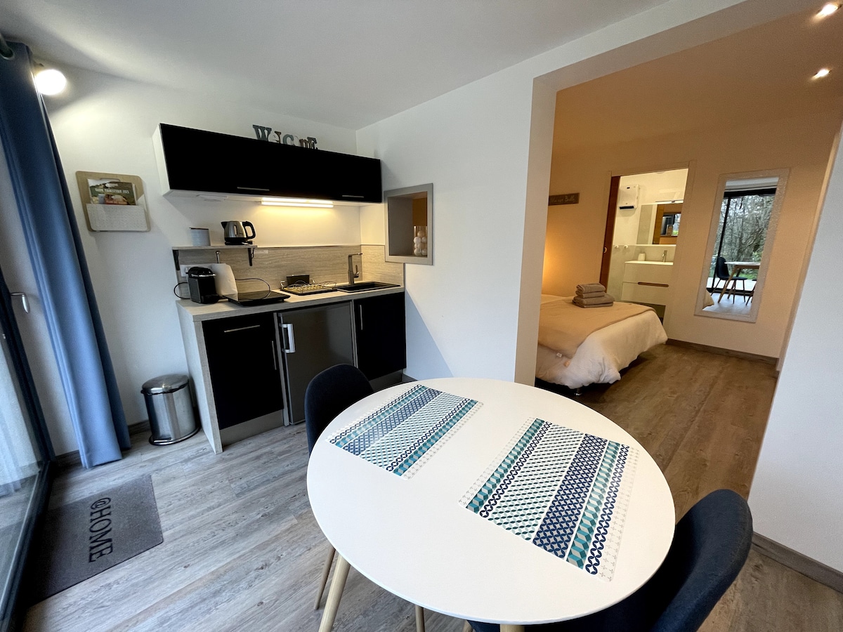 Ljus och luftig studiolägenhet i öppen planlösning, med privat pool och snabbt Wi-Fi. Stor TV med fransk Amazon Prime och brittisk Freeview. DVD- och Wii-spelkonsol och tillbehör. Franska och engelska DVD-skivor och brädspel. Köksområde med spis, mikrovågsugn och en airfryer för att laga lätta måltider. Nybyggt duschrum, eget badrum. Stora glasdörrar leder ut till en solig, möblerad uteplats med grill, med utsikt mot sjön och skogsområdena. Privat parkering Många promenader/cykelleder från boendet