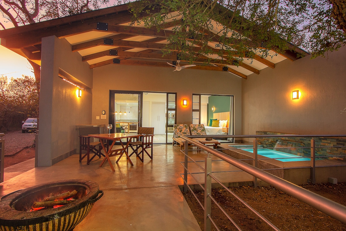 Helt ny lyxig fristad för par undangömd i typisk sydafrikansk bushveld med djur som besöker precis utanför dörren. Invånarfamiljen av bushbabies kommer att förtrolla dig med sina upptåg tidigt på kvällen. Välj att njuta av ett bad eller en dusch under stjärnorna i avskild domstol. Välutrustad med toppklassiga ytor för att matcha. Luftkonditionering, pool och gratis Wi-Fi. Backup inverterkraft samt backup vattenförsörjning. Skäm bort dig själv med en verkligt unik upplevelse.