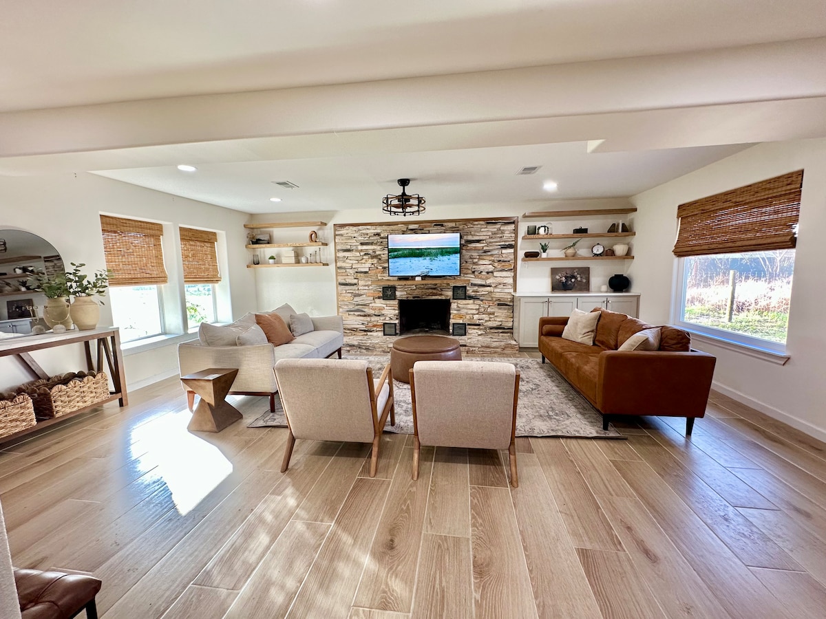 Our comfortable 3-bedroom, 2-bath guest house is the perfect retreat for event weekends and hunting trips. Just a 1/2 mile from a popular event venue, it's an easy stroll home after the party. In hunting season, we're a cozy and convenient basecamp for dove, whitetail, and quail adventures. Comfortably sleeps up to 3 adults OR up to 10 guests with couples and kids sharing beds. • Primary: King bed with private bath • Bed 2: Queen over King bunk bed • Bed 3: Queen over King bunk bed