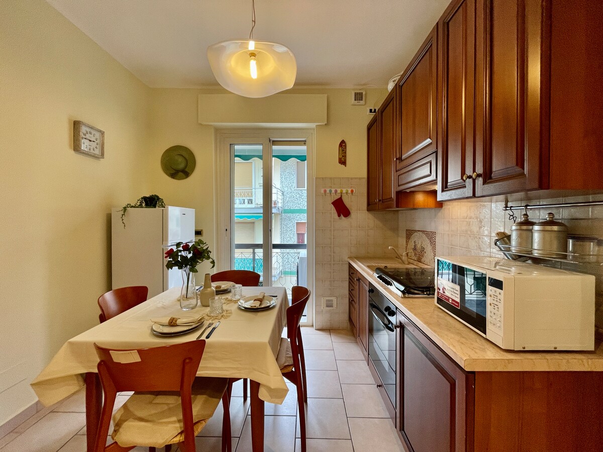 Ideale per vacanze o brevi soggiorni in famiglia, tranquillo e luminoso, in zona comoda alle spiagge e ai negozi. Situato al terzo piano con ascensore. Abbiamo 2 ampie camere matrimoniali, un spazioso soggiorno con divano letto e cucinino completamente attrezzato con lavastoviglie, forno, macchina caffè. Due bagni completi con doccia e lavatrice. Box auto e posto auto condominiale e ampio giardino condominiale. Dotato di lavastoviglie, lavatrice, wi-fi, Smart tv con Netfix, aria condizionata.